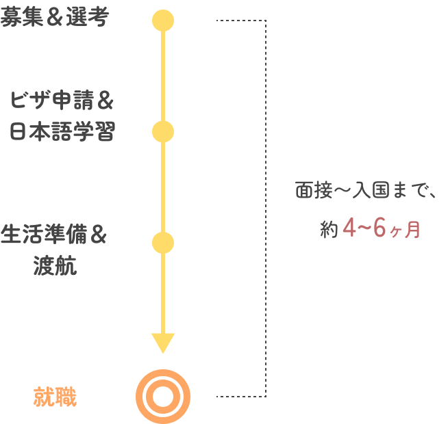 煩雑な連絡調整や手続きのサポートは、すべてRKIにお任せください。制度の理解が必要な書類作成や入国に向けた調整など、施設長様の手を煩わせる実務は弊社が主導して進めます。「採用の窓口」として一括して対応しますので、本来の施設運営に専念していただける環境を整えます。